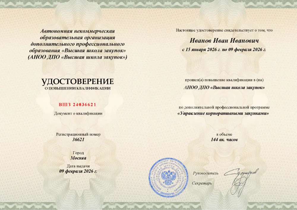 Вы получаете официальный документ о повышении квалификации. Высшая школа закупок (fz44.org) в обязательном порядке вносит сведения об обучении в Тамбове в реестр ФИС ФРДО, подтверждая легитимность вашей подготовки перед контролерами.