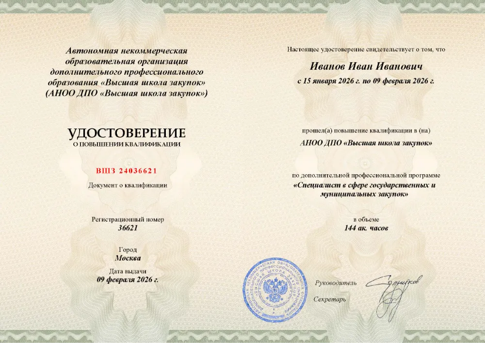 Вы получаете официальный документ о повышении квалификации. Высшая школа закупок (fz44.org) в обязательном порядке вносит сведения об обучении в Тамбове в федеральный реестр ФИС ФРДО, подтверждая легитимность вашей подготовки перед контролерами.