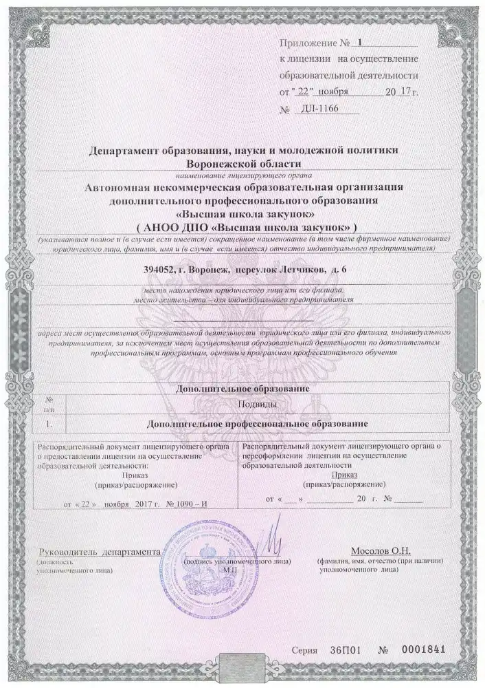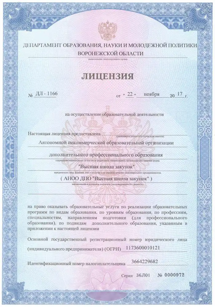 Высшая школа закупок (fz44.org) ведет образовательную деятельность на основании бессрочной государственной лицензии. Вы можете проверить актуальность документа по номеру в реестре Рособрнадзора, что гарантирует законность получения образования в Тамбове в 2026 году.